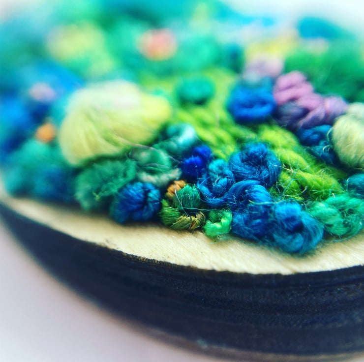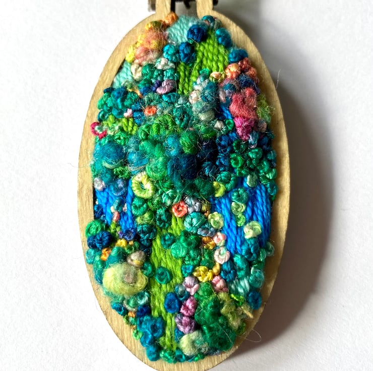 A beautiful hand embroidered pendant, inspired by beautiful gardens and made with the finest hand dyed silk and cotton threads and mounted in a wooden mini hoop pendant frame.
