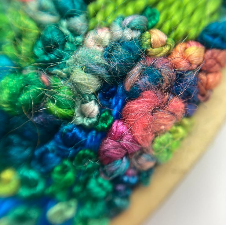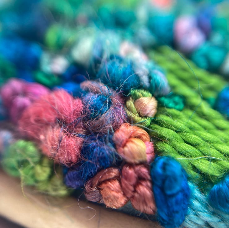 As with most of my embroidery, this piece started with the threads - they're hand dyed by the lovely Clare from Hope Jacare up in sunny Scotland, and the colours just made me think of Monet's Garden at Giverny (a frequent inspiration - have a look at my blog at www.theindecisivebeader.com to see the huge necklace I made a few years back using the same inspiration). I added a few plain colours of cotton perle to Claire's incredible space dyed slik threads (the lime and two shades of turquoise), laid down a base of horizontal and vertical satin stitch, and then went to town on the french knots using the different thicknesses and textures to create an impressionistic textured abstract landscape. A really enjoyable piece to stitch and wear.