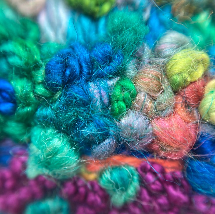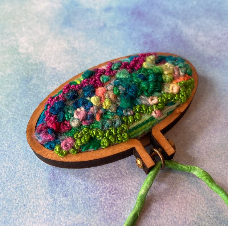 As with most of my embroidery, this piece started with the threads - they're hand dyed by the lovely Clare from Hope Jacare up in sunny Scotland, and the colours just made me think of Monet's Garden at Giverny (a frequent inspiration - have a look at my blog at www.theindecisivebeader.com to see the huge necklace I made a few years back using the same inspiration). I added a few plain colours of cotton perle to Claire's incredible space dyed slik threads (the green and magenta), laid down a base of horizontal and vertical satin stitch, and then went to town on the french knots to create an impressionistic textured abstract landscape. A really enjoyable piece to stitch and wear.