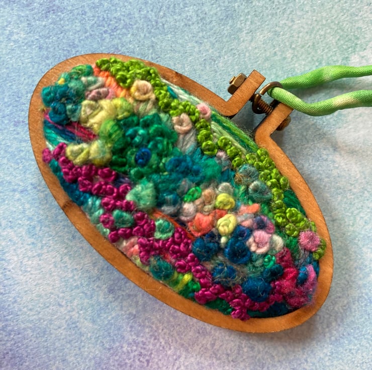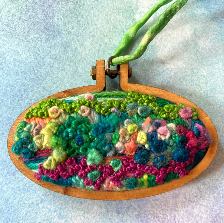 A beautiful hand embroidered pendant, made with the finest hand dyed silk and cotton threads and mounted in a wooden mini hoop pendant frame.
