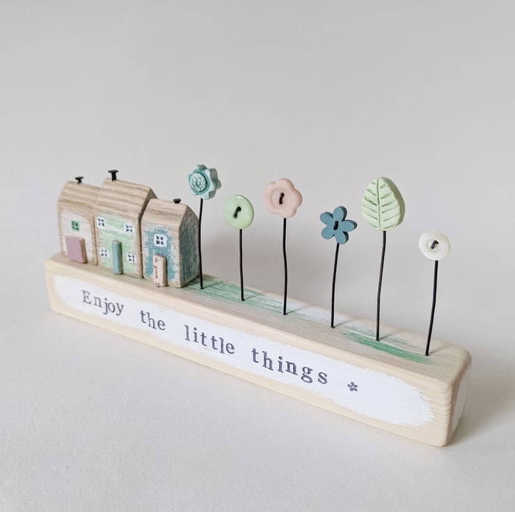 These little hand-painted wooden homes have teeny doors and windows and a garden of button and clay flowers.