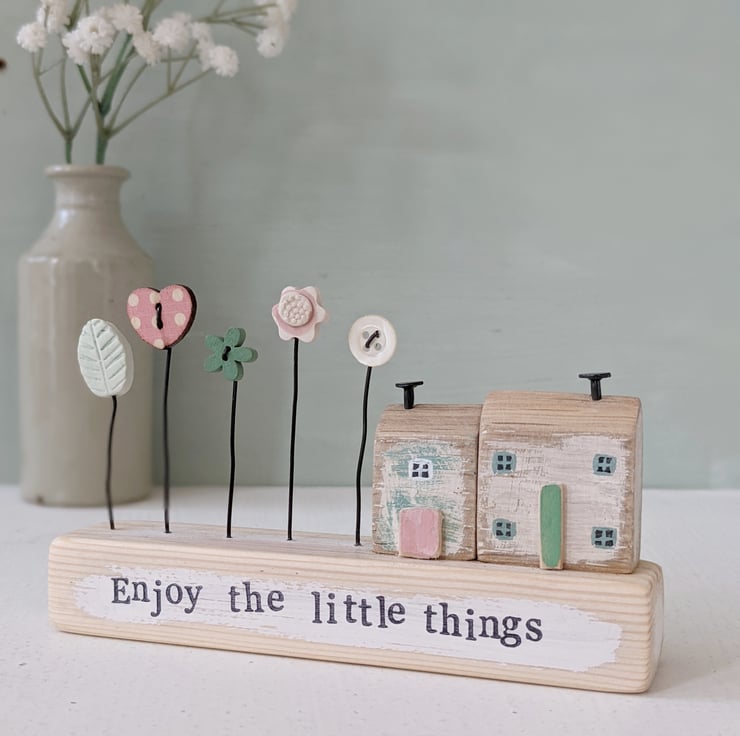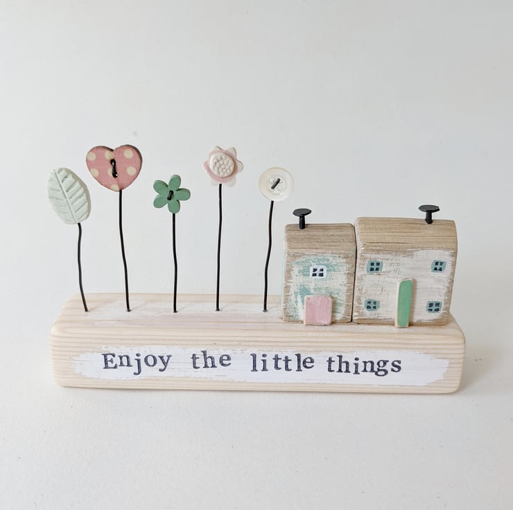 Hand stamped on the front are the words 'Enjoy the little things'.
