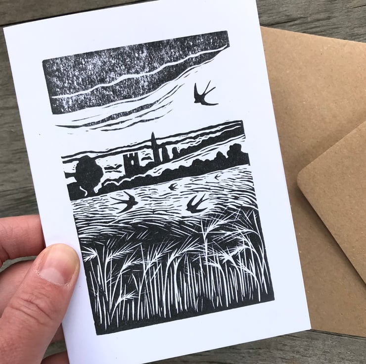 Printmaking artist Beth Knight creates small editions of hand printed lino cuts inspired by her local Suffolk scenes and also the wilds of Wales where she grew up. Her images convey the spirit of the natural world and the history and story of the landscape. Dogs and other favourite animals also feature in her work, capturing the movement and character of an individual animal with carefully thought out lines and shapes.
