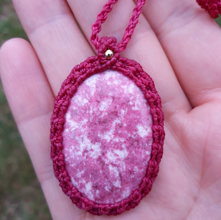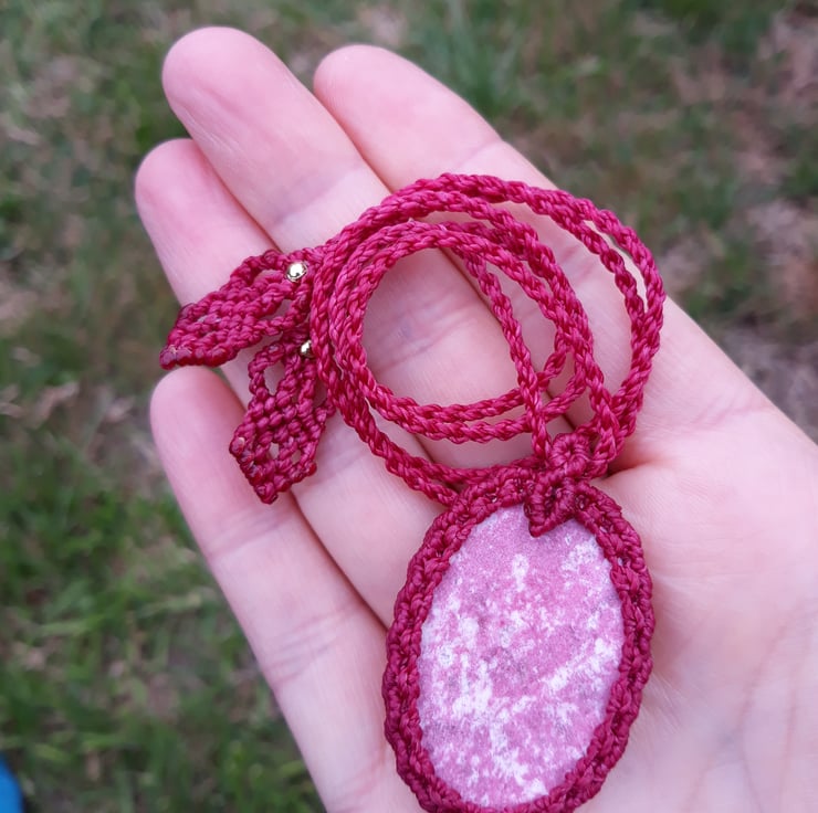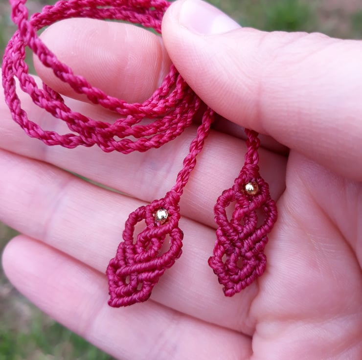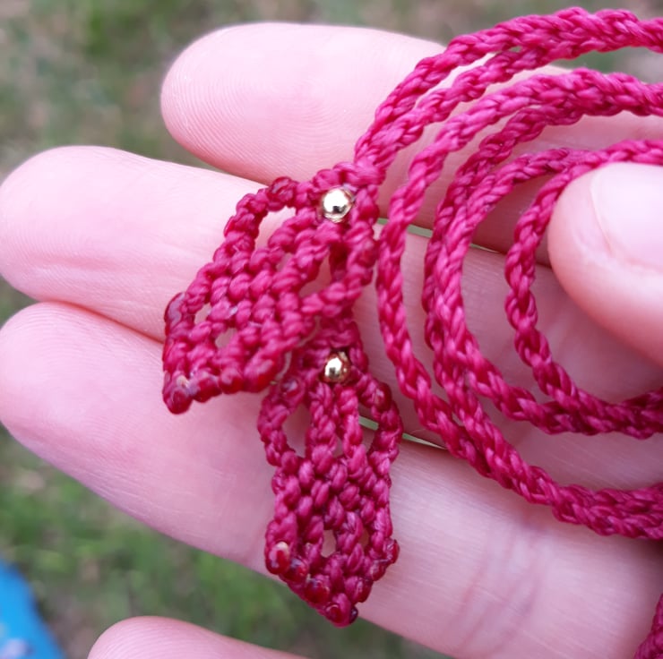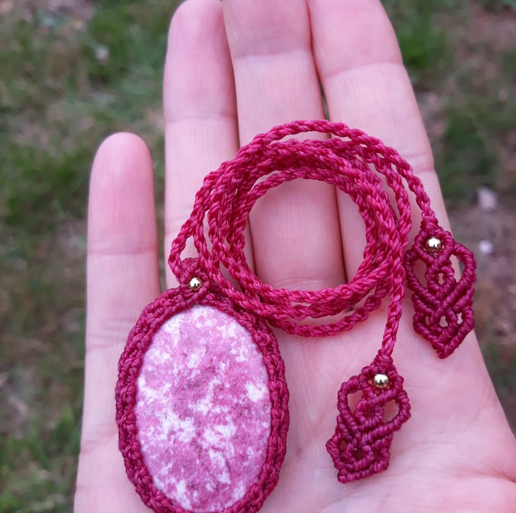 The pendant measures approx. 3cm in width and 4.3 cm in length. Made using a good quality thread. The beads are gold coloured plastic. The cord is a handmade 4 braid with a drop of 55cm finished with detailed cord ends.