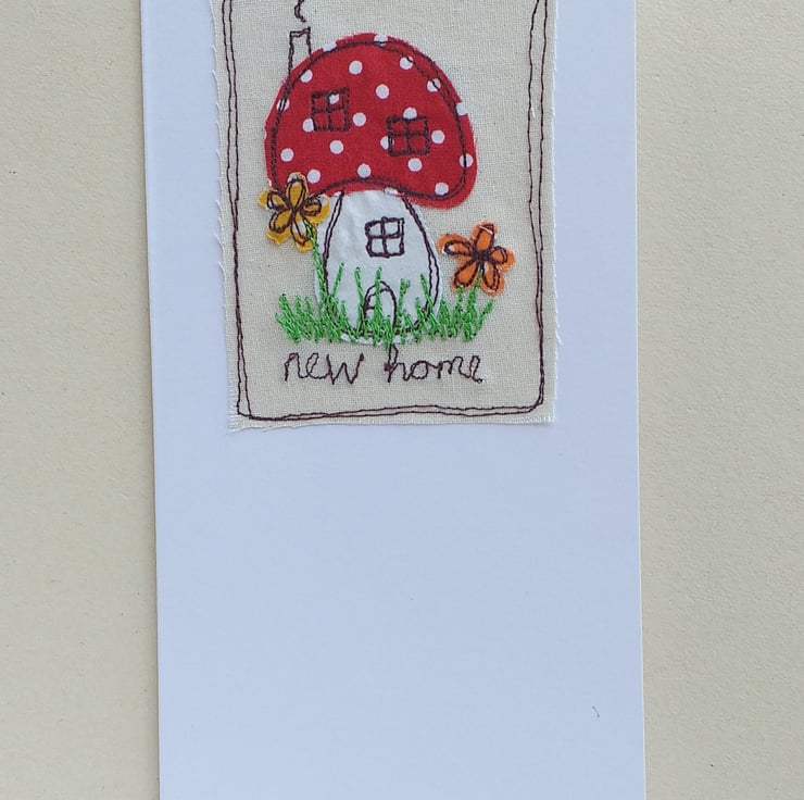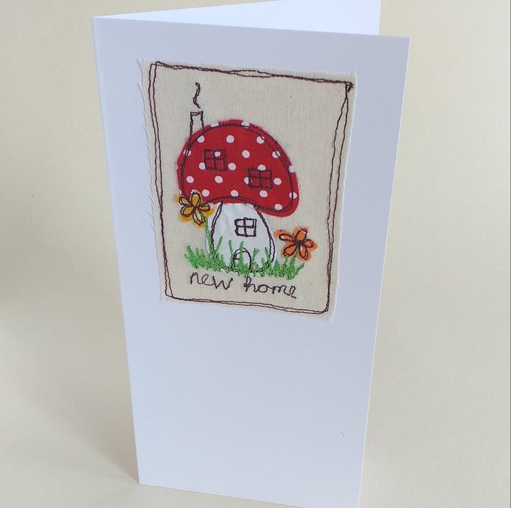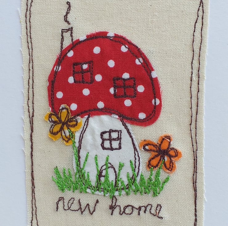 A cute New Home card featuring a fairy-style toadstool house. It is made with fabric scraps appliqued on to a plain backing fabric and sewn using freestyle machine embroidery. The whole design is then sewn straight on to a plain white card. This card can be personalised.