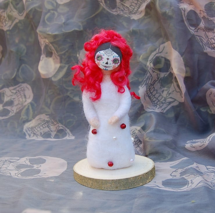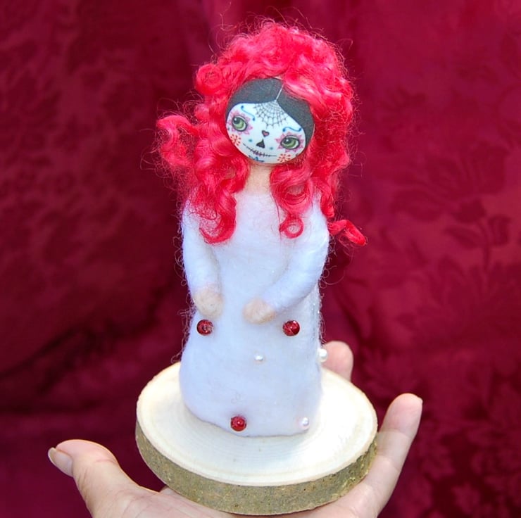 Her solid body is made from wool core needle felted into a shape. Soft unspun wool fibre with a sparkle has been lightly needle felted for her dress. I've given her red hair made from dyed wool locks. Her sugar skull mask is a large button. Beads are sewn onto her dress. Glued onto a wood slice for stability.