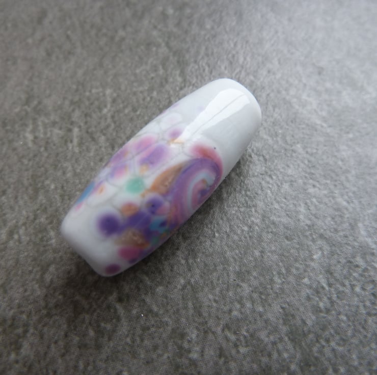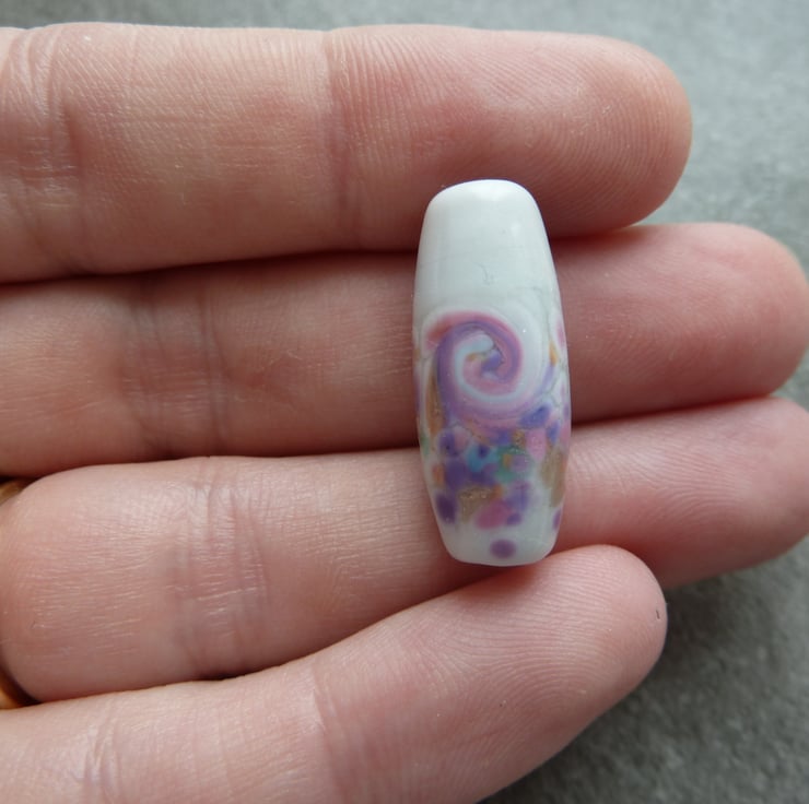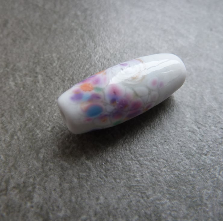 A lampwork glass bead made with grey glass, rolled in frit and hand shaped.