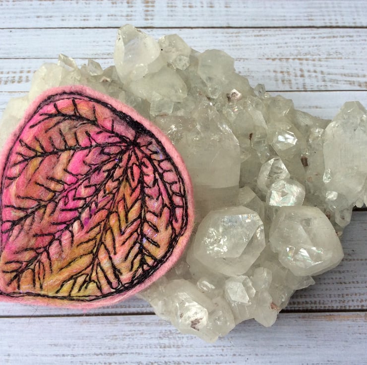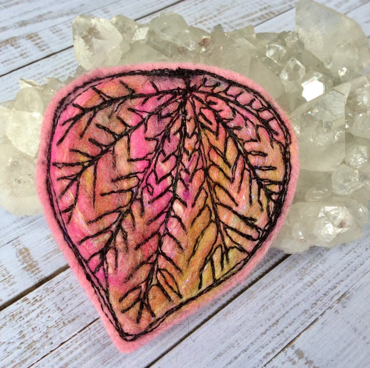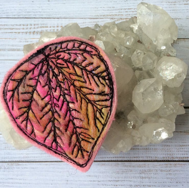 Eye catching original handmade needle felt free motion embroidered leaf brooch. It has a brooch pin with a safety catch on the reverse to keep it nice and secure. It measures 7 x 6cm approx.