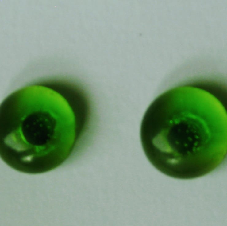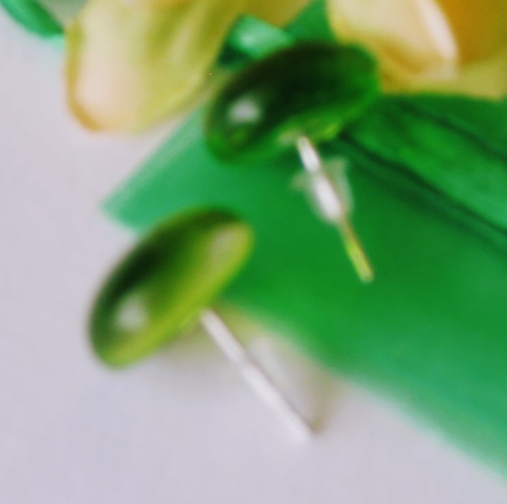 Pair of transparent apple green on clear 14mm round stud earrings. Handmade from quality Bullseye glass. Created by kiln fusion. Sterling silver ear posts with soft rubber hypoallergenic safety stoppers.