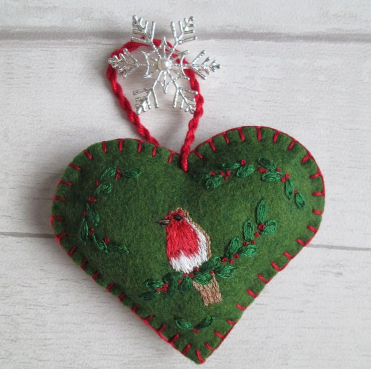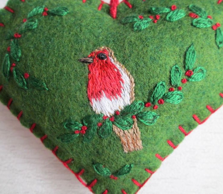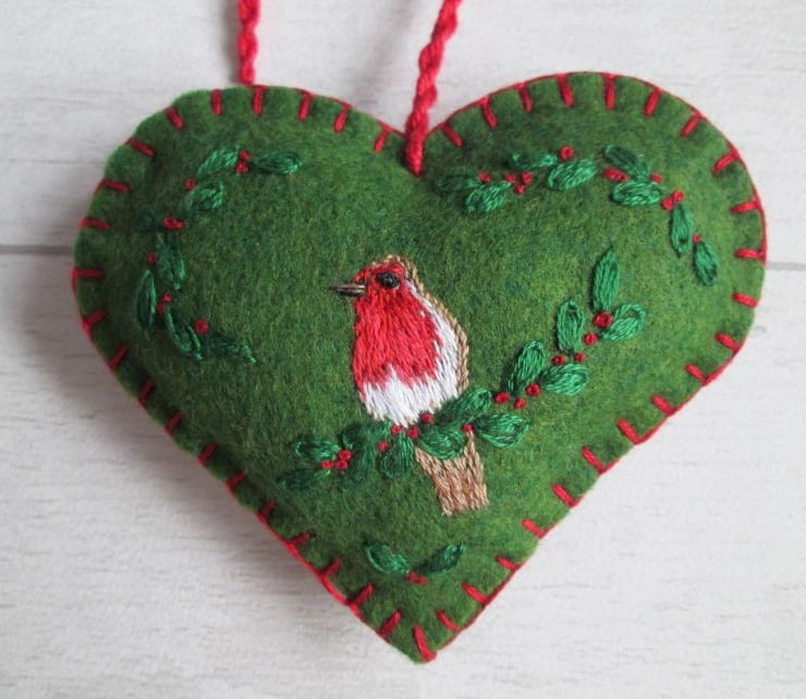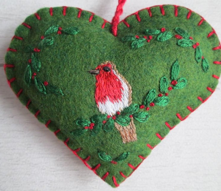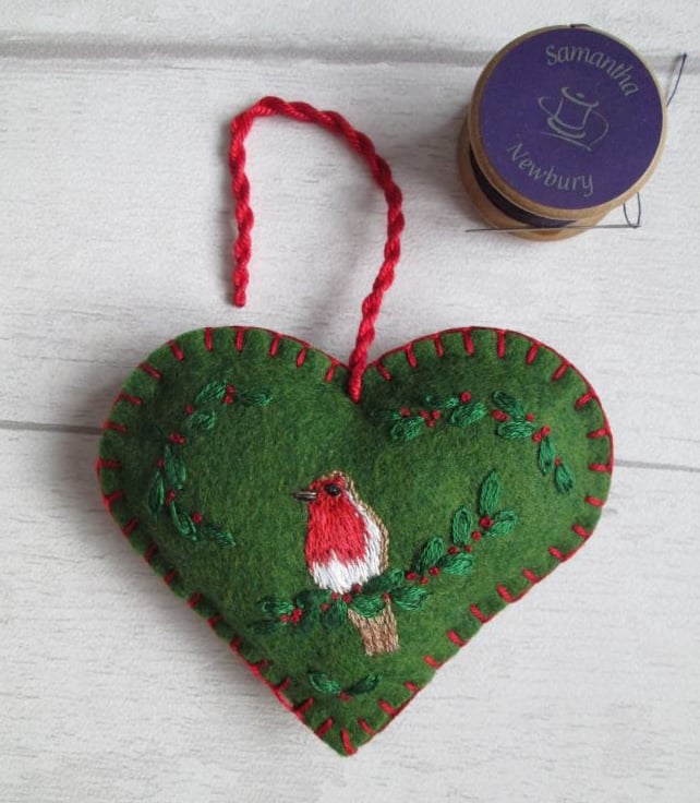 2021 Keepsake Heart Number 4 - Robin - beautiful moss green wool felt, painstakingly hand embroidered with a cheery little robin upon a holly branch, surrounded by more holly. Finished with crimson blanket stitch and a matching twisted thread hanging loop, this one of a kind heart measures just 9.5 cm wide by 8 cm high.