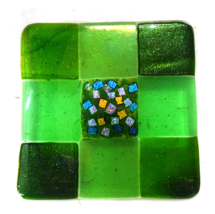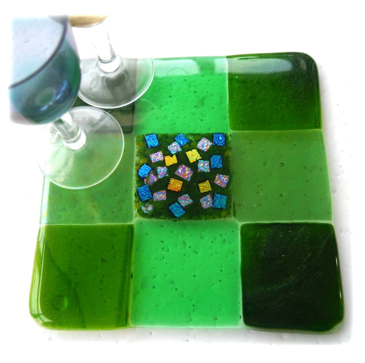 The trivet has a base of clear glass which is then topped with 8 x 4cm squares of Green glass, 4 different types..