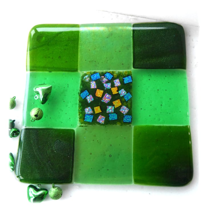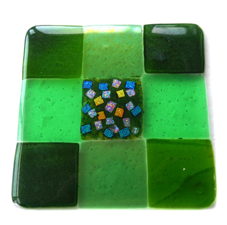 The square in the centre is formed from frit which I've made from a mix of green glasses and it's then topped with chips of both clear and black backed dichroic. This gives it a lovely luxurious look.