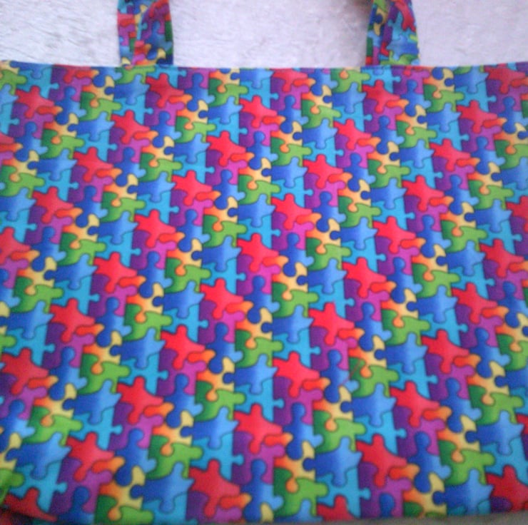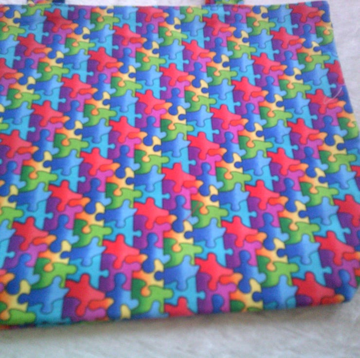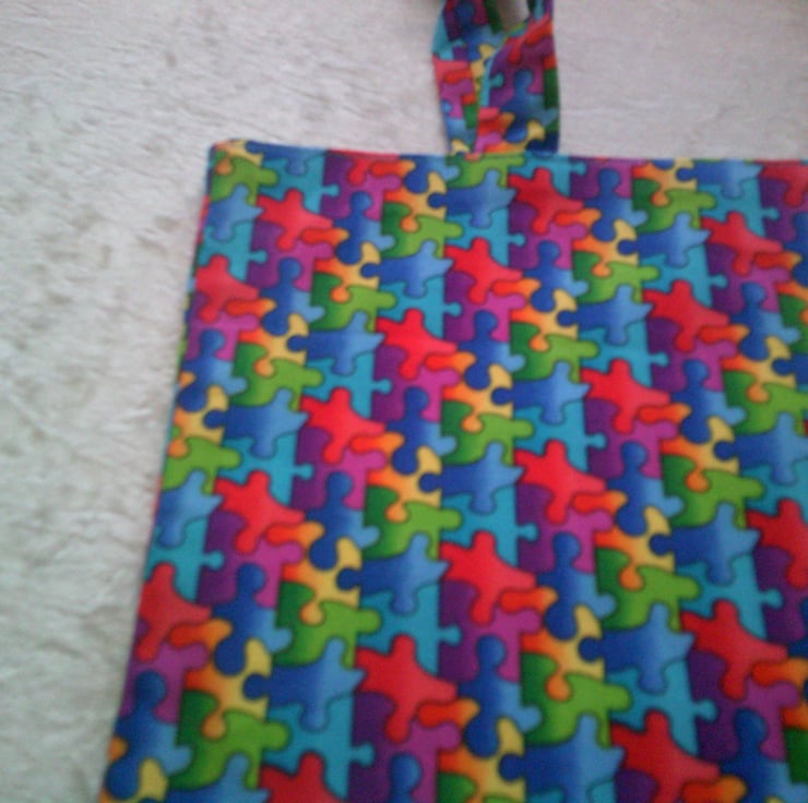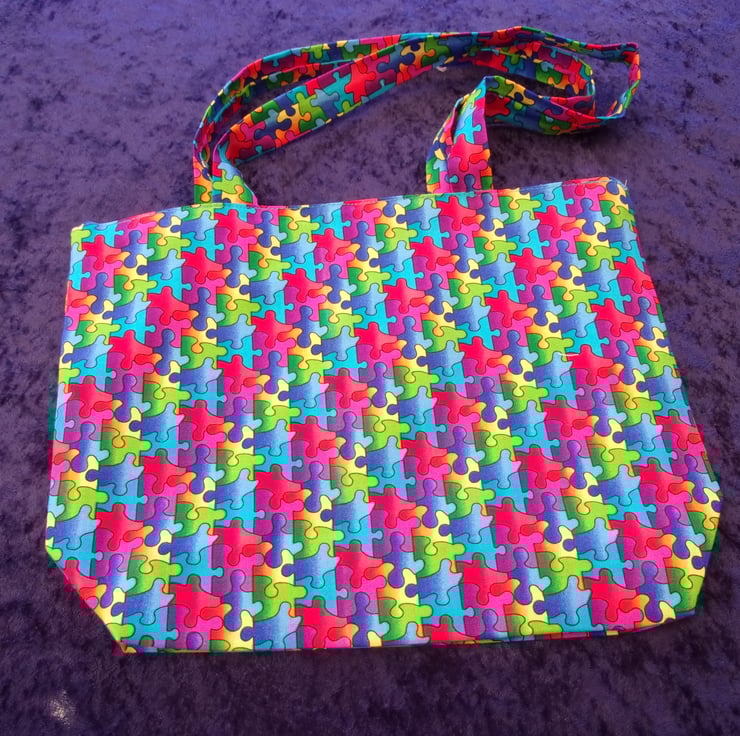 The fabric used has a design featuring brightly coloured jigsaw pieces in blue, pink, yellow, green and purple.