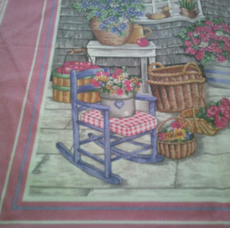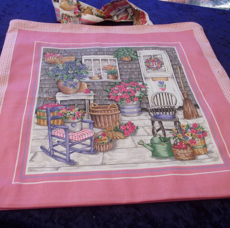 This Eco Friendly, fabric bag is made using 100% Cotton panels with pictures of a lovely courtyard style garden with a rocking chair and wooden arm chair along with pots of flowers and watering cans all outside the backdoor and is surrounded by a pink border. Both sides of the bag are the same.