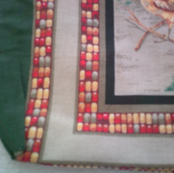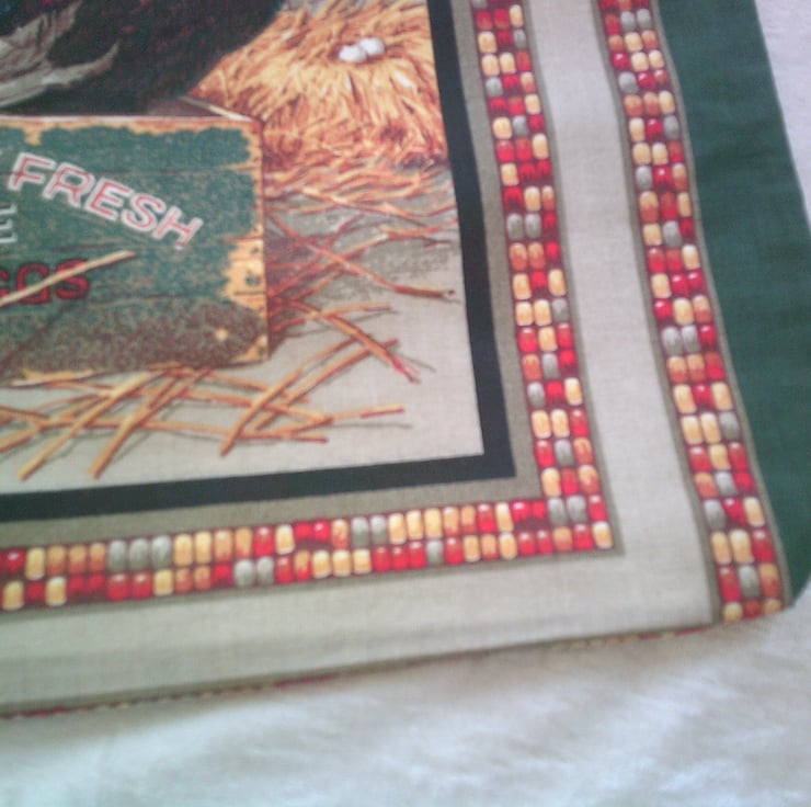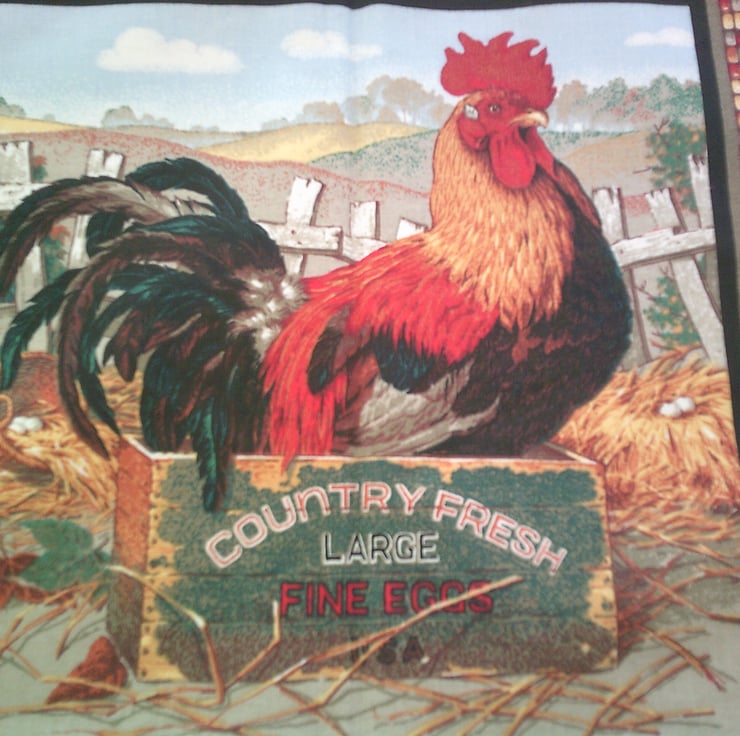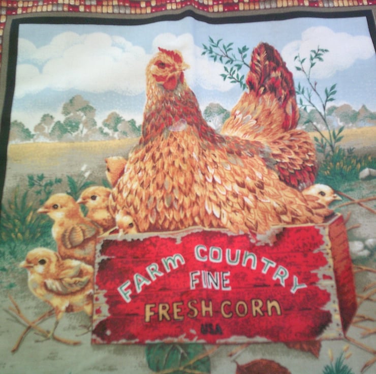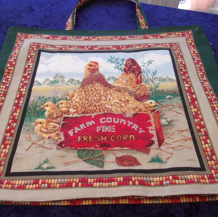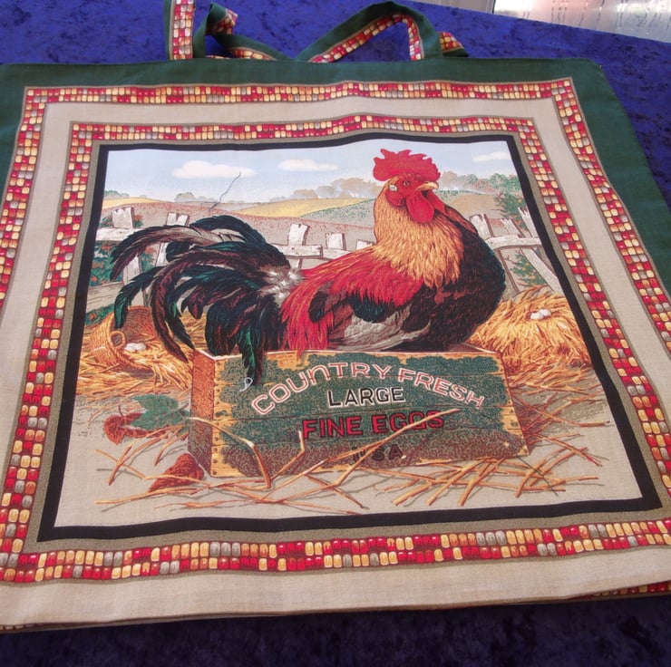 This Eco Friendly, fabric bag is made using 100% Cotton panels with pictures of a Cockerel on one side and a Hen with her chicks on the other side. The border on this bag is of different coloured corn and a solid green border.