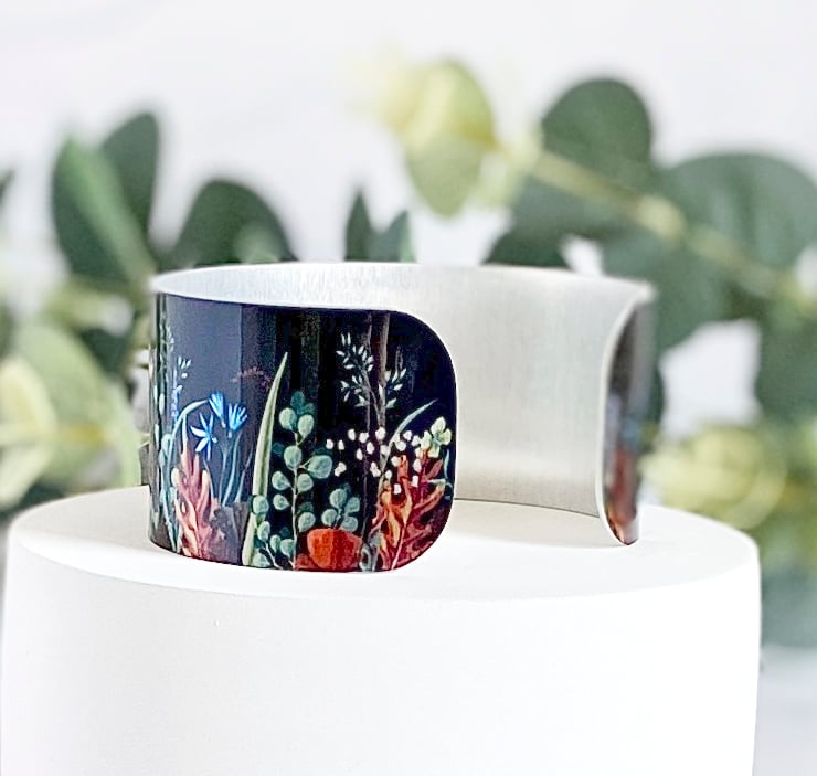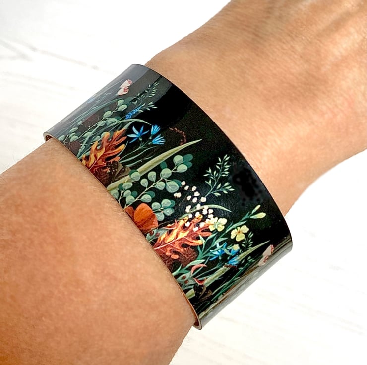 I've handmade this bracelet from aluminium with an autumn woodland design. Matching earrings and pendant available. In addition, for a small fee, a personalised message can be engraved on the reverse (Optional).