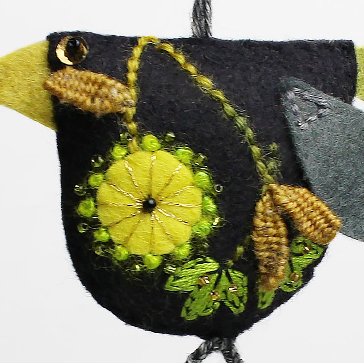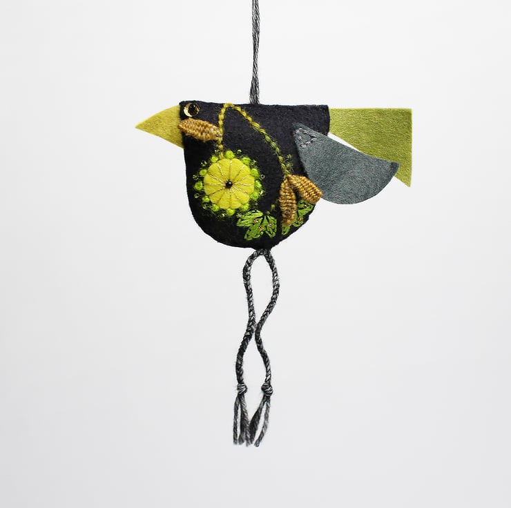 The embroidery on the bird is inspired by a mid-century ceramic design.