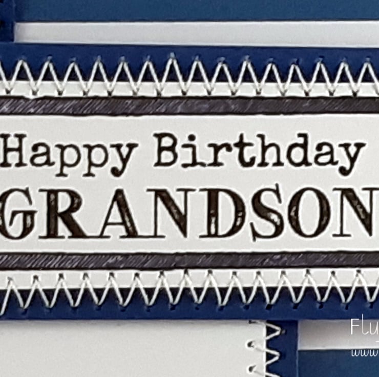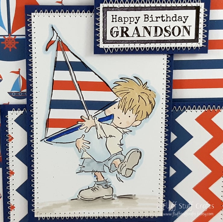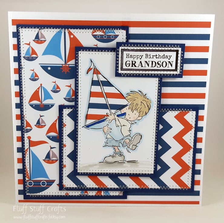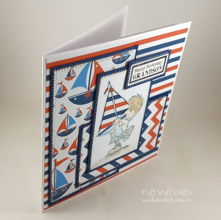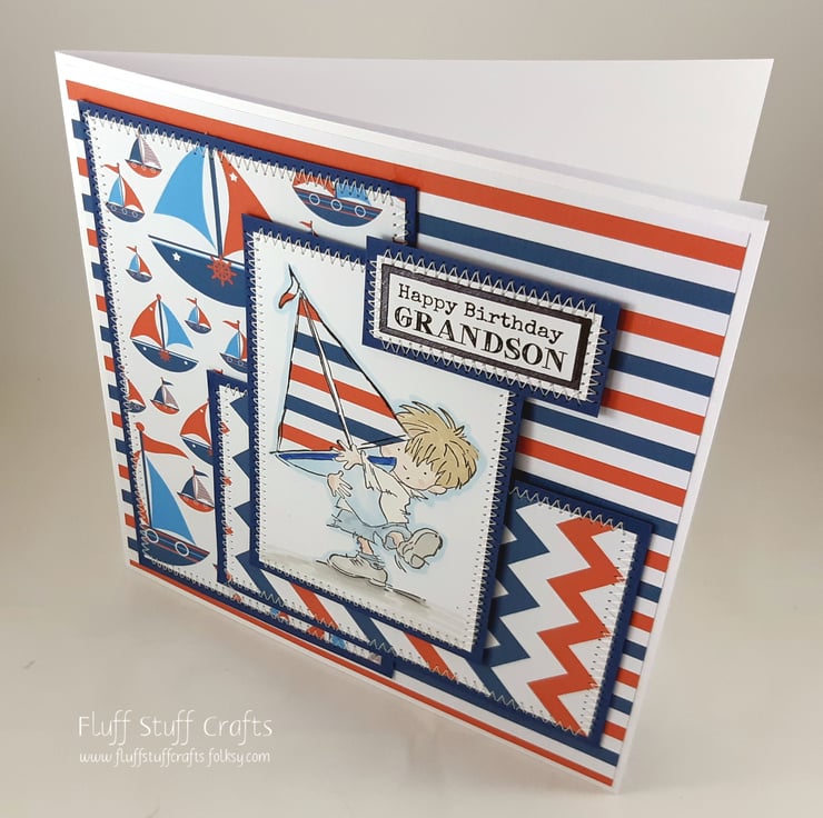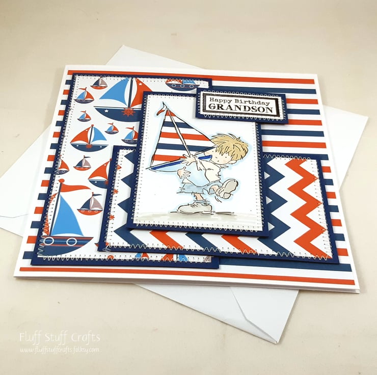 Square birthday card featuring a hand coloured image of a boy with a sailing boat. The colour scheme of the card is red, white and blue and the sails of the boat have been paper pieced to match the background papers. The image has been stitched onto dark blue card along with the sentiment 'Happy Birthday Grandson' and overlaid onto two coordinating panels of patterned paper, over a striped background.