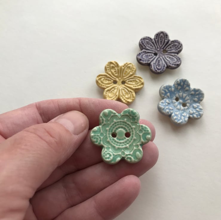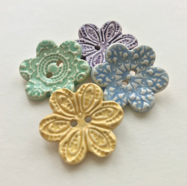 This set of four flower shaped pottery buttons are made from white earthenware clay, embossed and glazed on the front. They are then fired to 1100 degrees, so nice and strong. They measure 2.8cm. They can be handwashed or machine washed on a low temperature. Perfect for all sorts of arts and craft projects