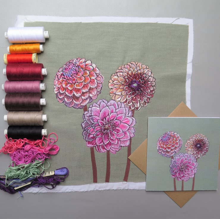 Original fabric appliqué designs which have been scanned, and then printed onto recycled card.