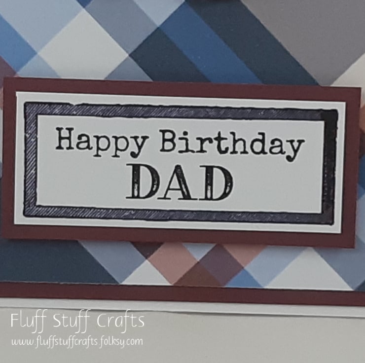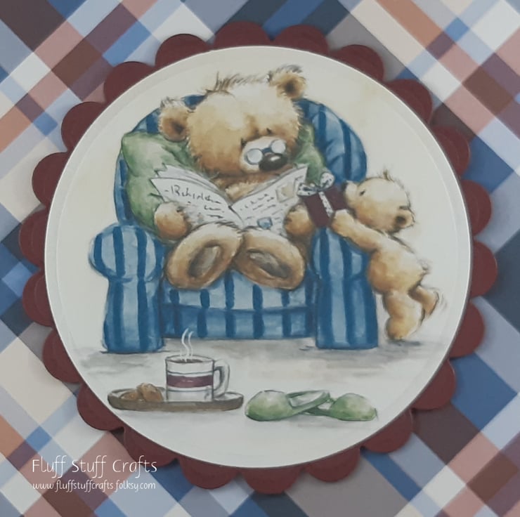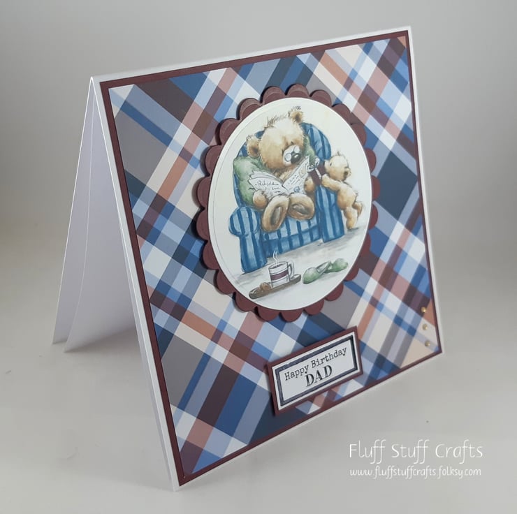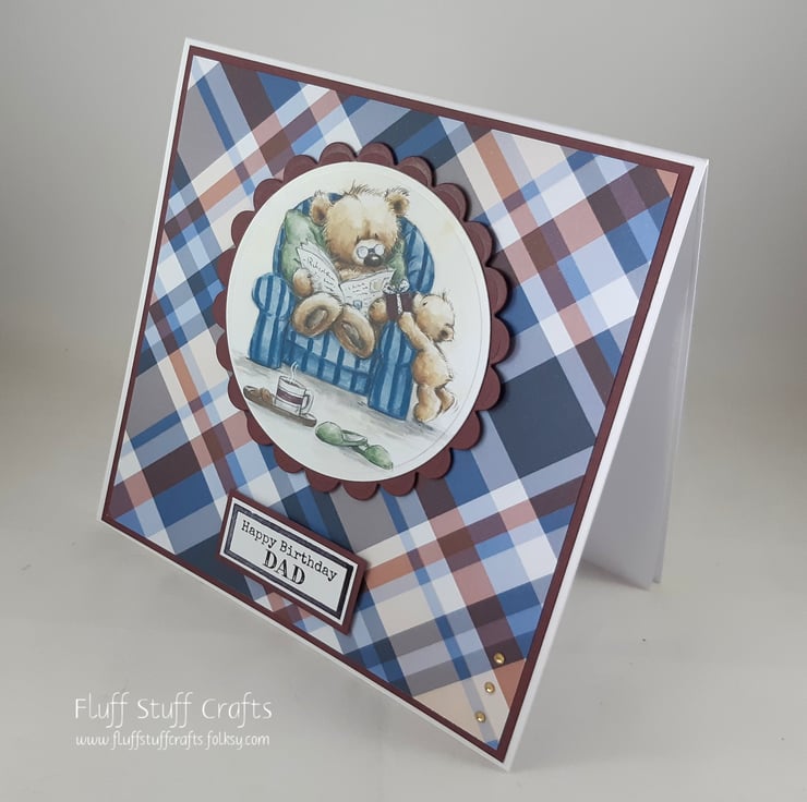 Larger sized, square birthday card for Dads, standing in a tent folded style. The card shows an image of a bear sitting in his armchair reading his newspaper, while a small bear passes him a gift. The sentiment 'Happy Birthday Dad' and the image are mounted onto burgundy card and overlaid onto a tartan background. The card is embellished with 3 small gold coloured gems.