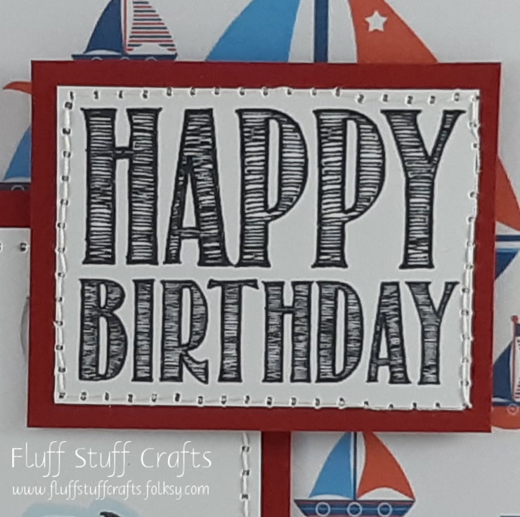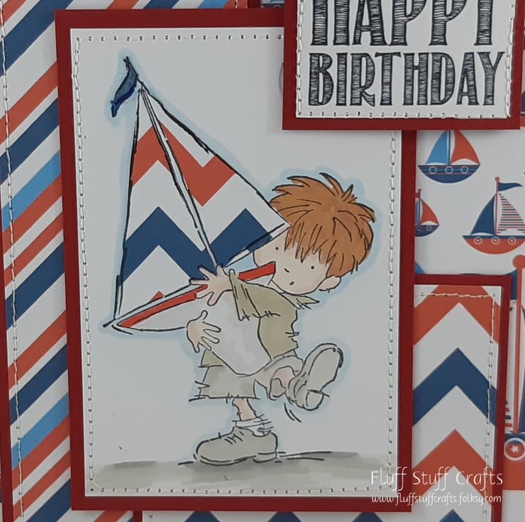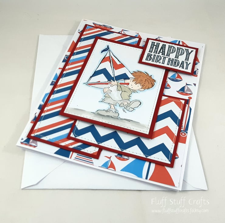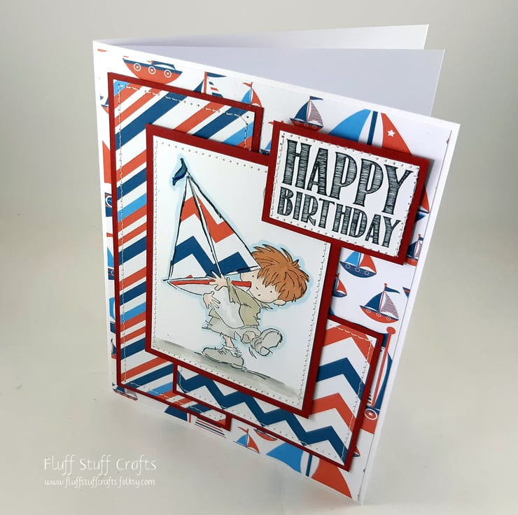 Children's birthday card featuring a young boy with his sailing boat. The image has been stitched onto red card, together with the sentiment 'HAPPY BIRTHDAY' and overlaid onto a sailing boat background. There are two other coordinating panels of patterned paper and the sails of the boat have been paper pieced to match. The insert has been left blank.