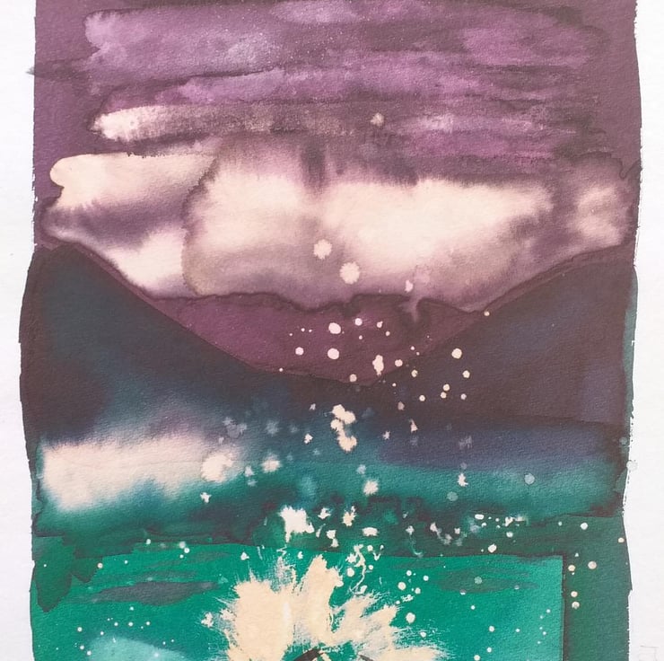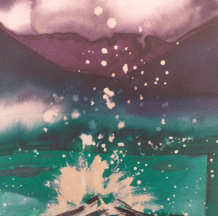 This is a giclee print of one of my earliest works exploring inks, then using bleach to lift out colour. It really made the campfire flames and sparks come to life against the night sky.