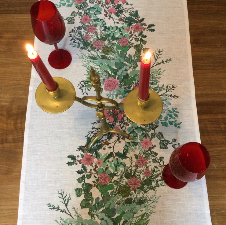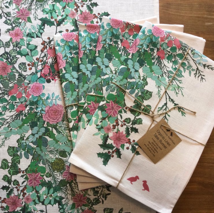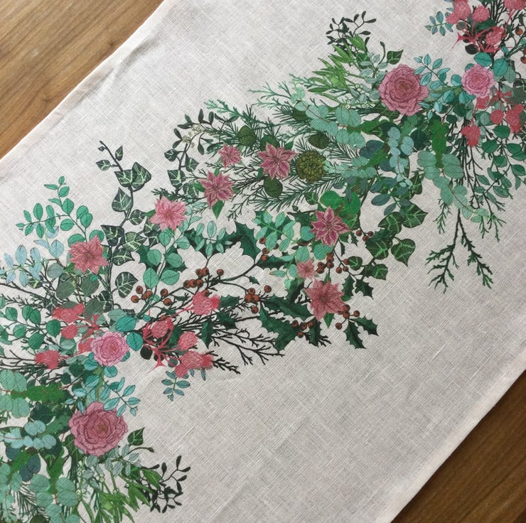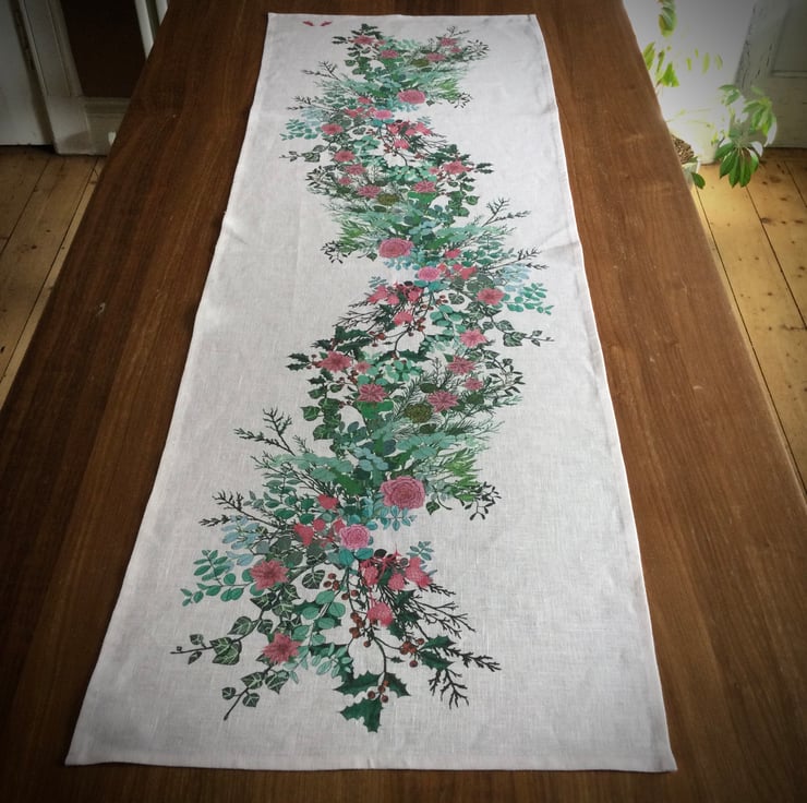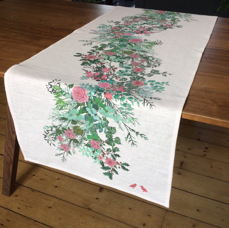 This organic linen table runner would look beautiful on the Christmas table but can also be used throughout the year. The floral garland design features hand drawn holly, ivy, eucalyptus, mistletoe, roses, fir tree branches, fir cones, thistles and poinsettias.