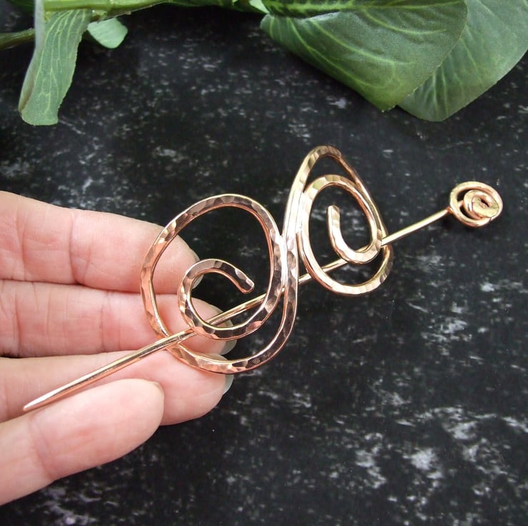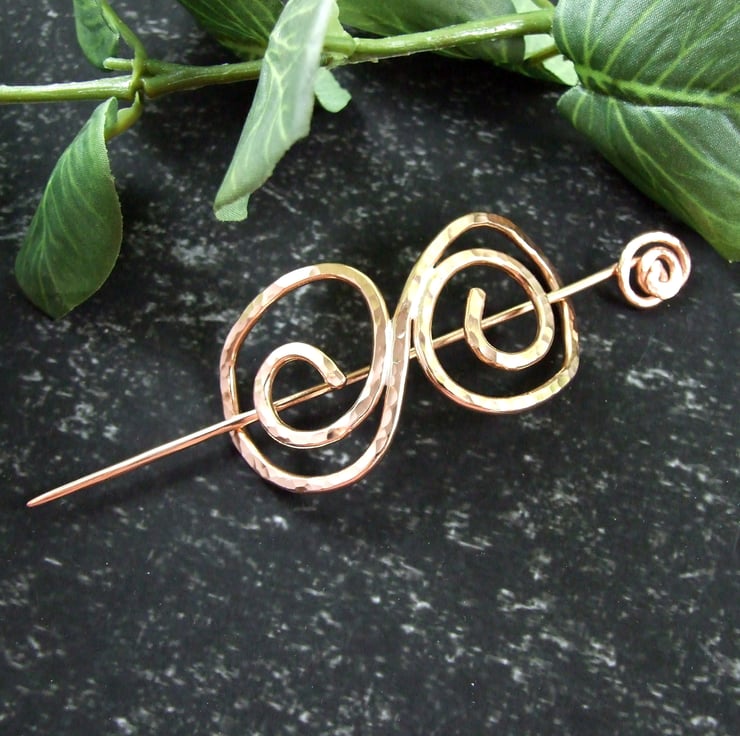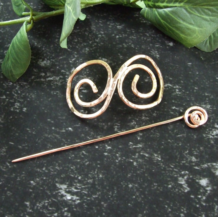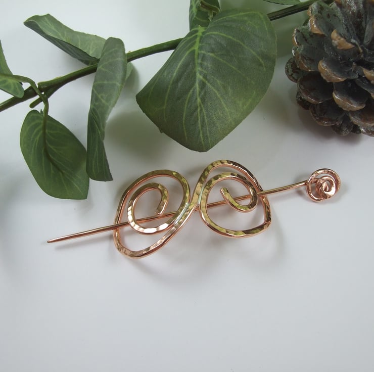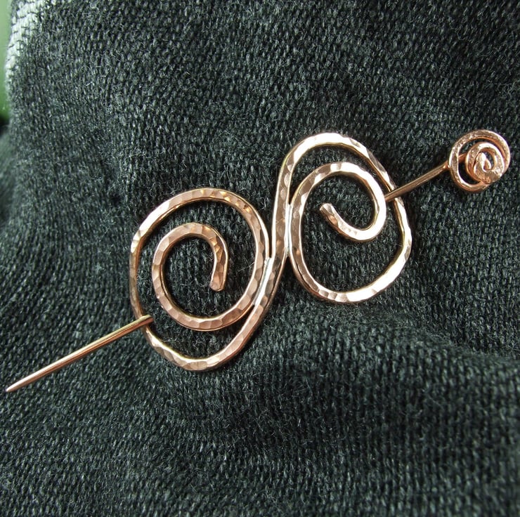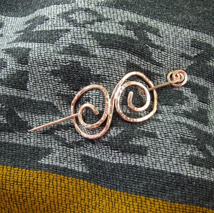 The spral is hand forged from 2.5mm solid copper wire with hammered texture. The pin is made from 2mm wire, shaped with a rounded blunt point and a coil formed at the other.