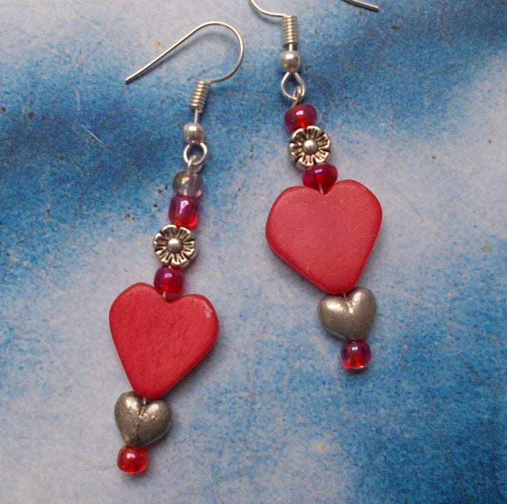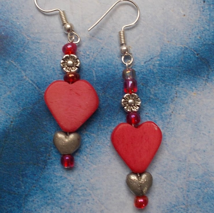 Such lovely earrings for you or someone you love. Red wooden hearts with Tibetan silver roses and tiny silver hearts with red glass beads tangling on sterling silver nickel free hooks. Free UK postage.