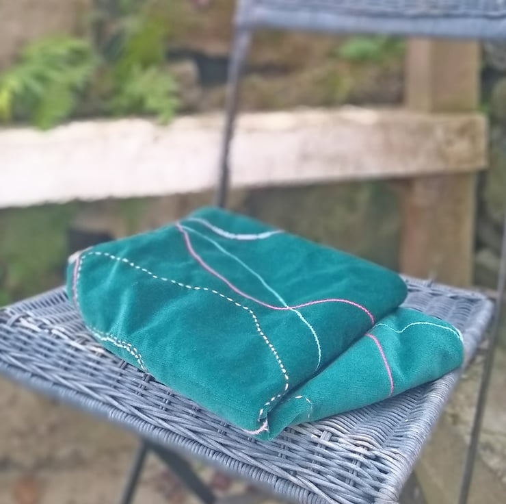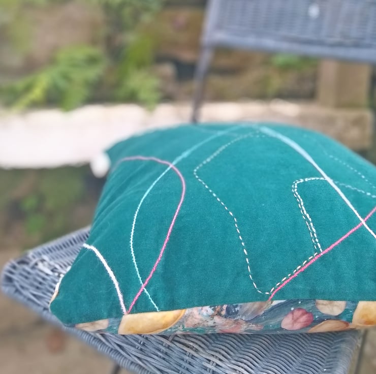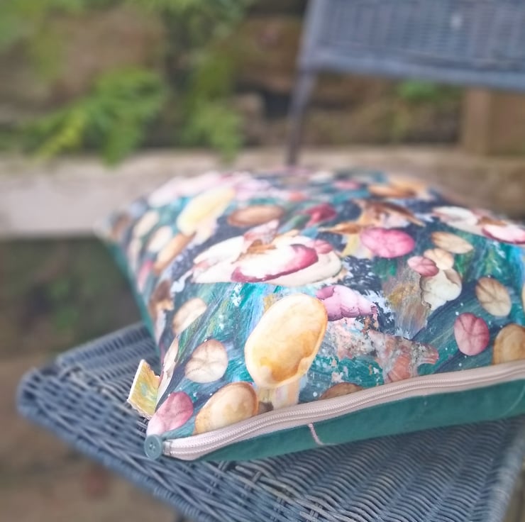 A sumptuous cushion cover featuring my 'Port Eynon' design printed onto soft velvet by a company in the UK. Backed in vintage dark teal velvet, with machine and hand embroidery, fully lined in taupe cotton and finished with a zip, it would make a decorative addition to any home.