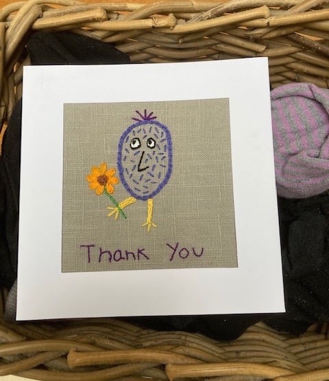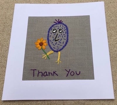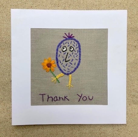 This is a thank you Bogle. Bogles live in the back of your cupboard, in your sock drawer and many other locations around the home. They are mischievious but friendly. The Bogle has been hand embroidered onto natural linen and mounted in a white aperture greetings card (144mm x 144mm) and comes with a matching white envelope. The inside of the card has been left blank for your own message.