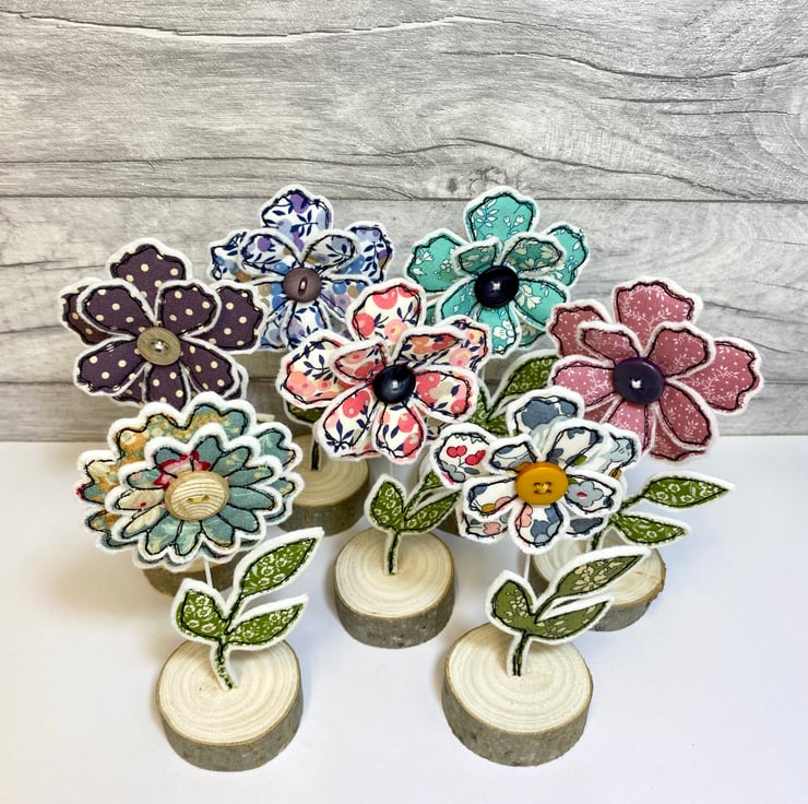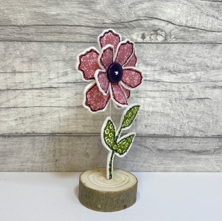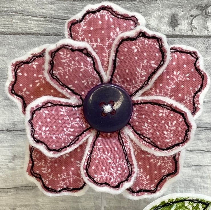 A double layered flower hand cut from liberty fabric and adorned with a button. It is attached to a wire stem where a fabric leaf is adhered and secured into a wooden stand. The flower and leaves are freestyle machine embroidered onto a felt background, this is done using my own hands, not computer based.