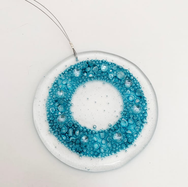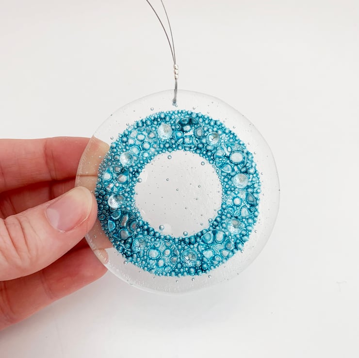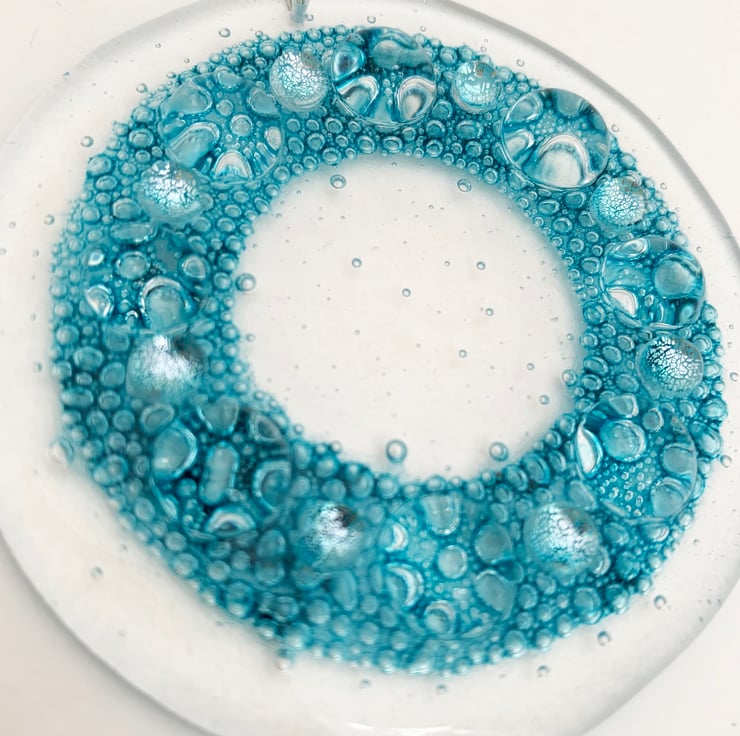 To make this I started with cutting 2 circles of transparent art glass. I handpainted my ring design using specialist glass paint and capped with the second circle of glass and fired overnight in my kiln. The heat of the kiln turns the paint into tiny turquoise bubbles. When completely cooled and washed, I added the dichroic dots and fired it again. The next day, I added the hanging wire.