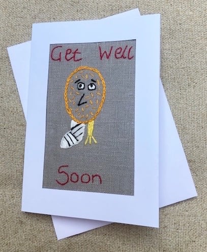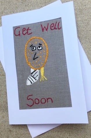 This characterful, get well Bogle has been hand embroidered on natural linen and mounted in a white aperture greeting's card (4" x 6") and has been left blank inside for your own message. Bogles are naughty little creatures who live in our homes, eating socks and disrupting things when we're not looking. They are however quite nice too!