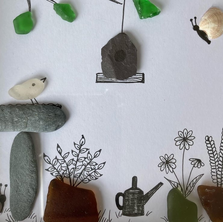 Garden design hand drawn in ink with a pebble bird bath, sea glass plant pots and birds, shell butterfly and snail.