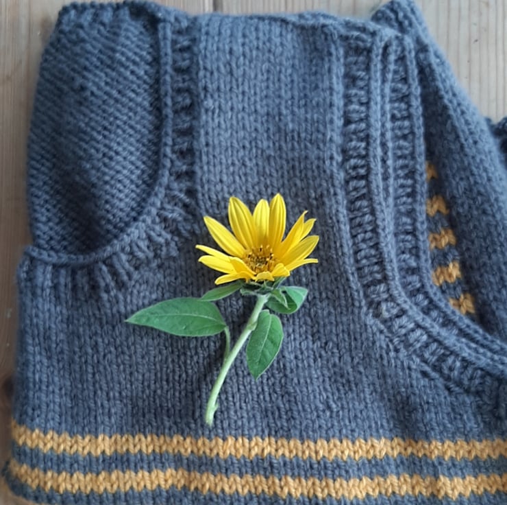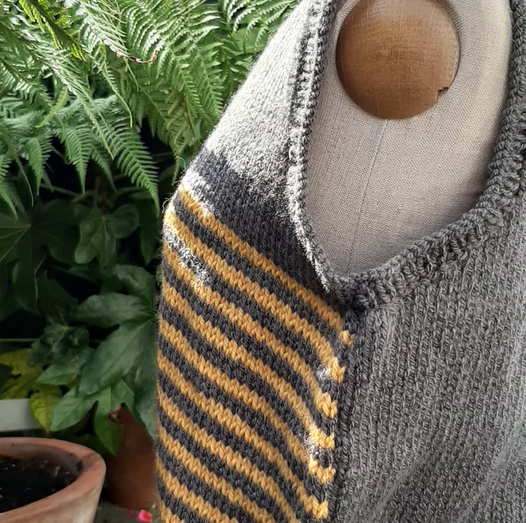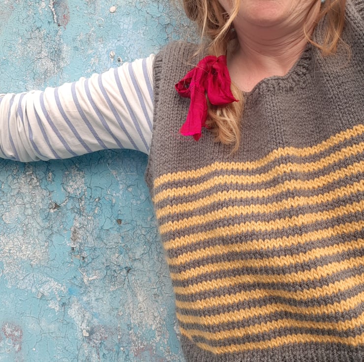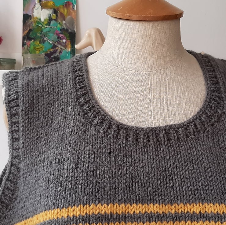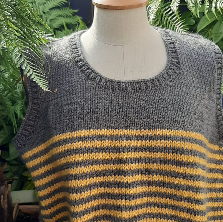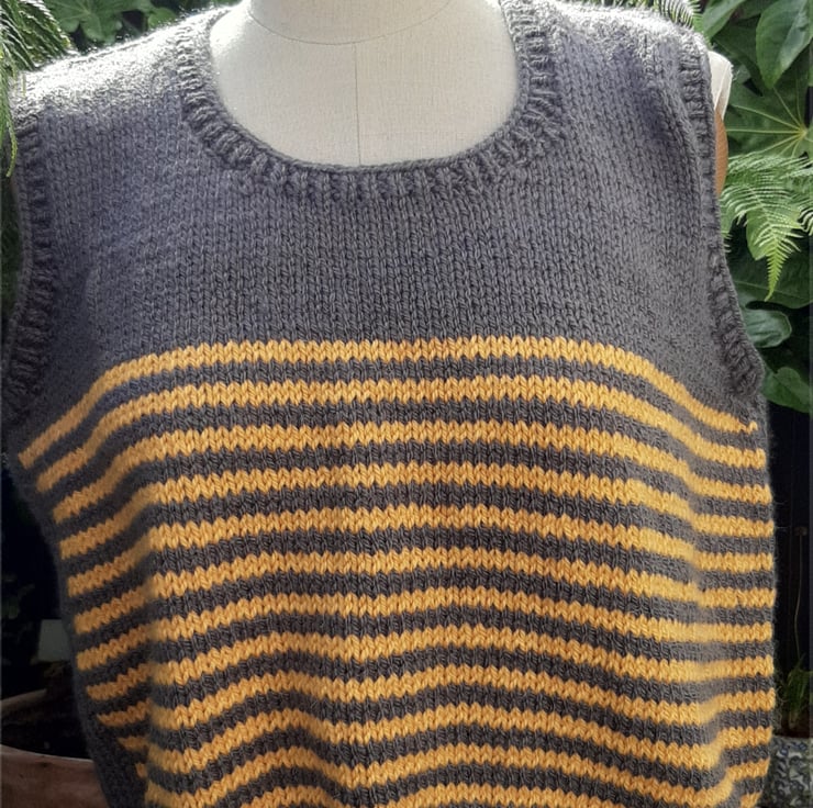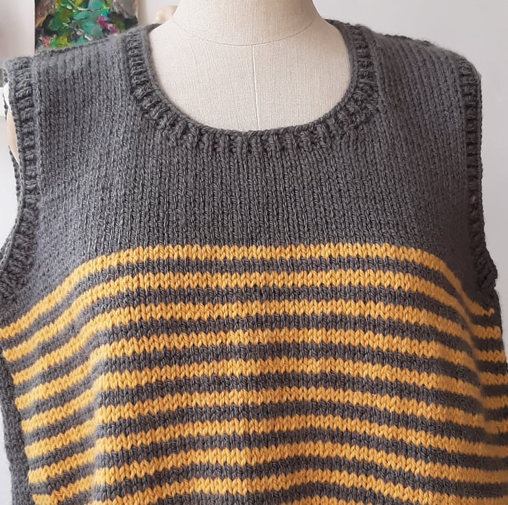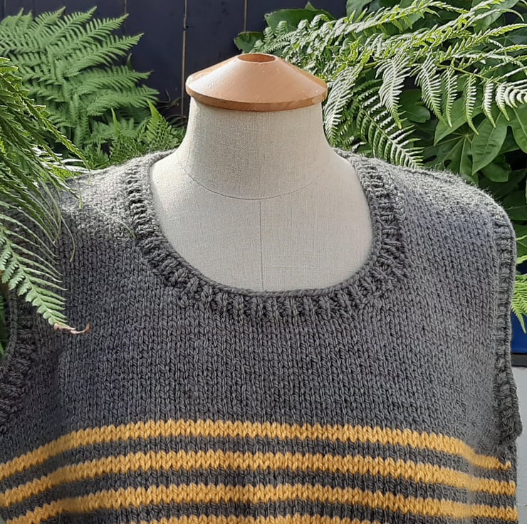 Beautiful tank top very cute short length .hand knitted with care. 49 cm long and 51 from arm pits. Easyer to wash as a wool acrylic mix