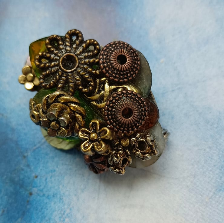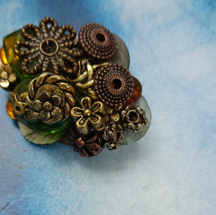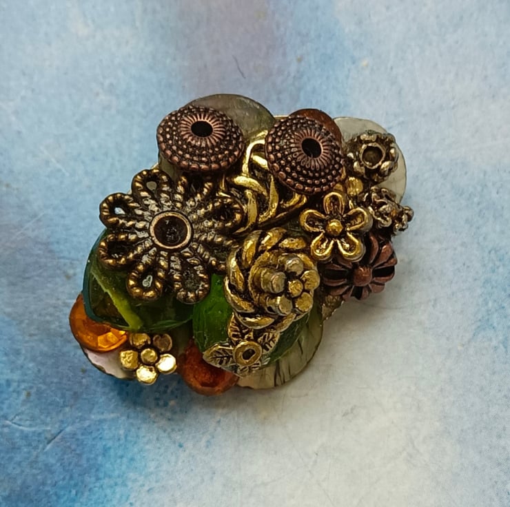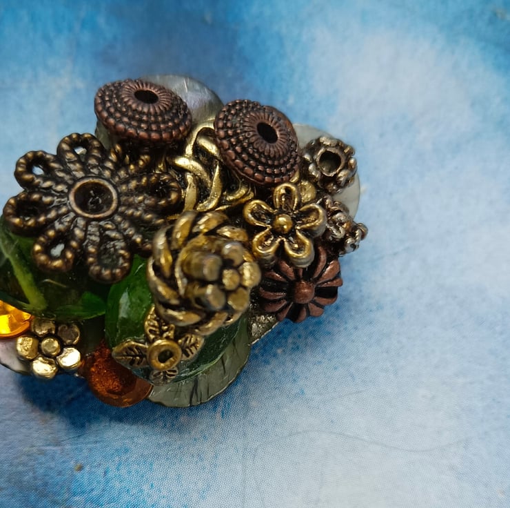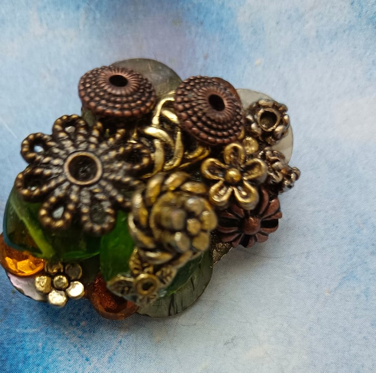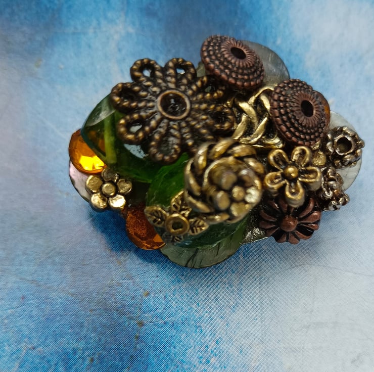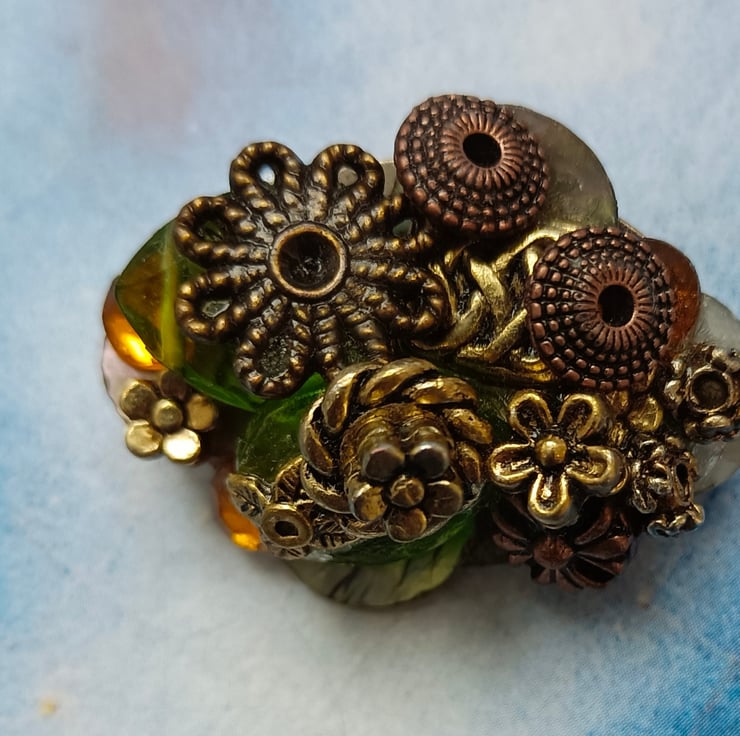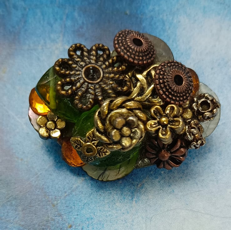 A glorious mixture of gorgeous gems in a scrumptious pile! Featuring antique bronze and golden beads and flowers, amber and green twinkly beads and mother of pearl shell pieces. All sitting on an oval shaped brooch with a pin and a safety catch on the reverse. Free UK postage.