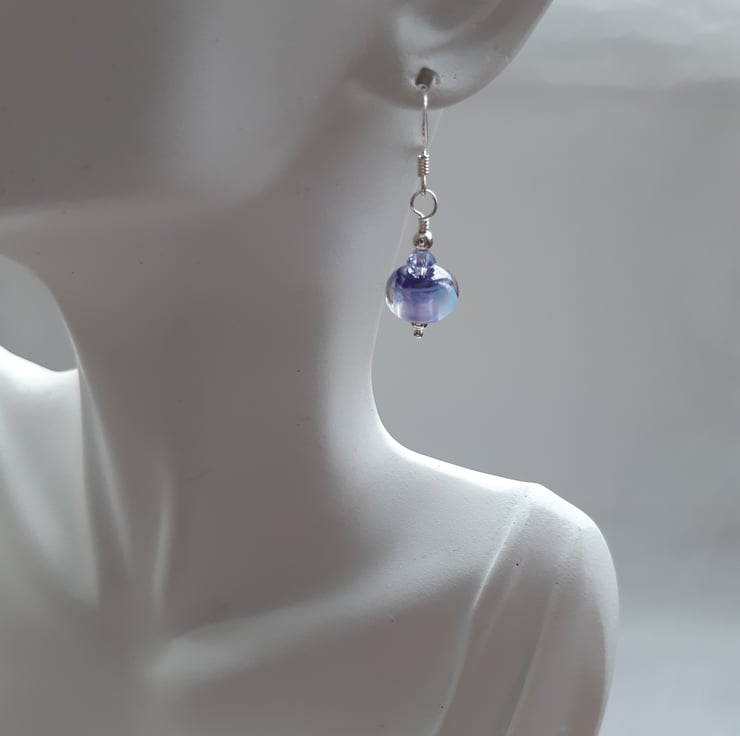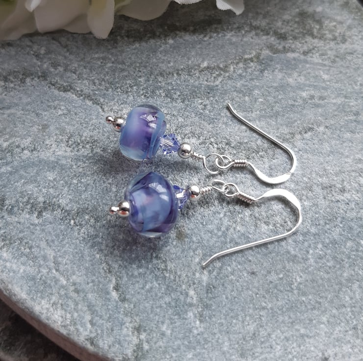 Sterling silver earrings with lovely handmade lampwork glass beads made in the UK which are a pale lilac and swirls of purple with lilac swarovski® crystals.