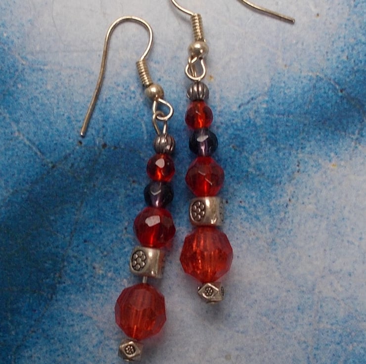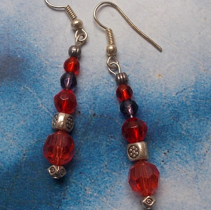 Fabulous hippy dippy earrings, incredibly lightweight, lovely colours, featuring red and purple glass beads in different sizes and tiny Tibetan silver beads with patterns. Hanging on sterling silver nickel free hooks. Free UK postage.