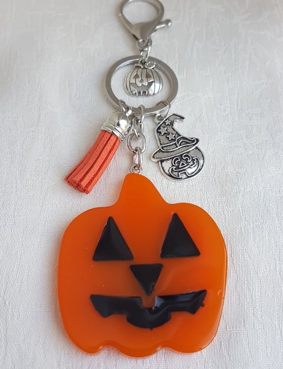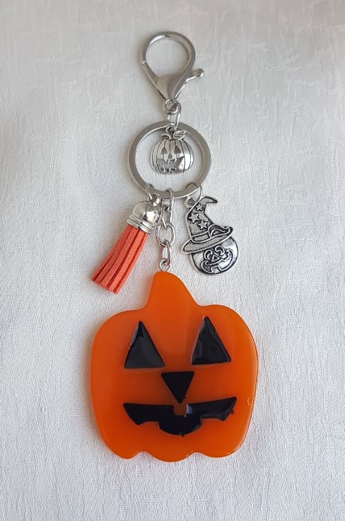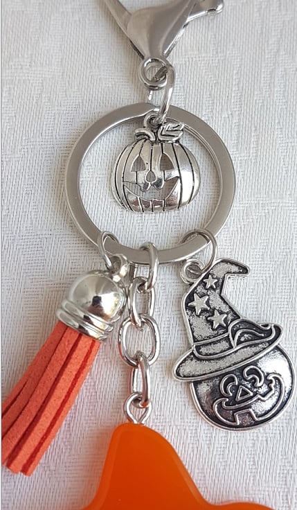 Key Ring Size is approx 15.5 cm from the top of the Clasp to the bottom of the large pumpkin. The Pumpkin itself is approx 6cm H x 5.5cm W and made of orange and black resin. Small pumpkin charms are Tibetan Silver and one is wearing a wizards hat, tassel is Orange suede.