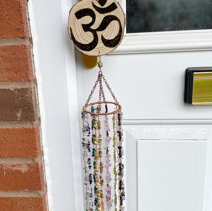 A hanging wind chime / home decoration ornament featuring a pyrographed wooden om symbol with various gemstones suspended below the wooden slice.