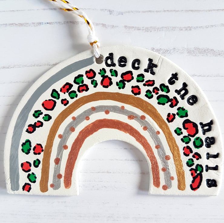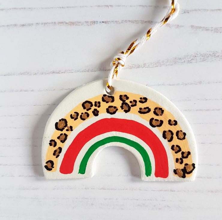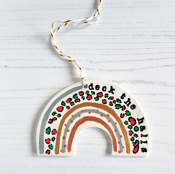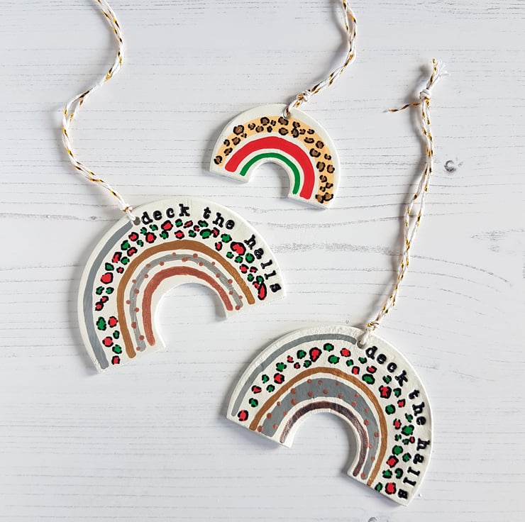 A gorgeous handmade rainbow shaped decoration, made using air dry clay, then hand painted using acrylic paints. Some rainbows have had stamped along the side too, which is carefully filled in by hand using acrylic paint. The rainbow is then sealed with a matt varnish, before having twine attached, ready to hang in your home!