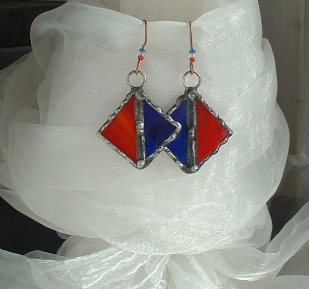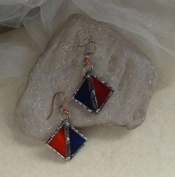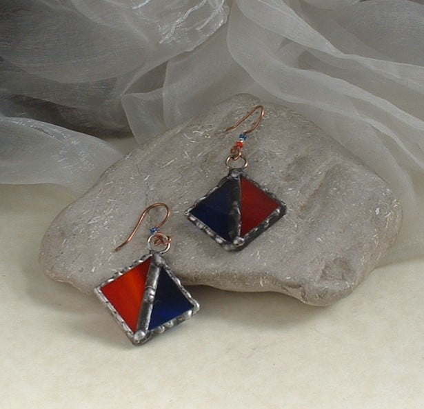 Lovely vibrant earrings created using deep blue and semi opaque red glass which has been hand cut, copper foiled and decorative solder added to give texture and detail. A silvery black patina has been applied and then polished to bring out the highlights. Handmade copper ear wires with tiny red, white and blue seed beads completes the design.