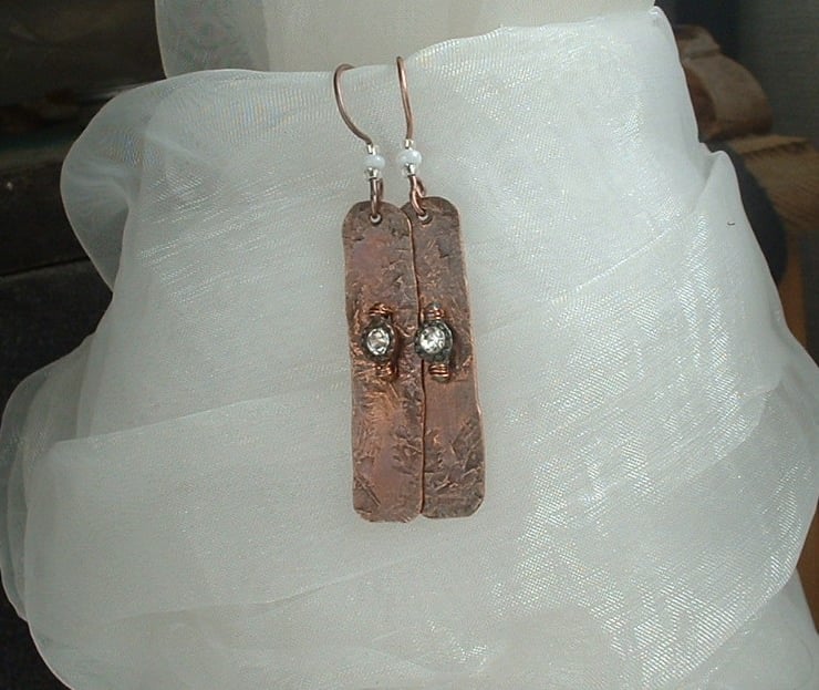 I love these earrings...the texture of the copper gives a feeling of antiquity and the sparkle of the diamante a touch of glamour. Made from strips of copper plate cut and filed to shape and then hammered to add the lovely texture. The beads have been attached with fine copper wire and they are finished with an antique patina sealed with a silicon wax polish. Handmade copper ear wires with shell and glass seed beads completes the design.