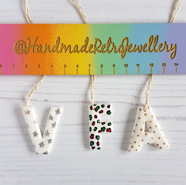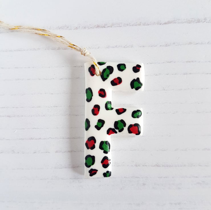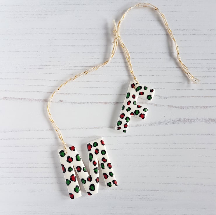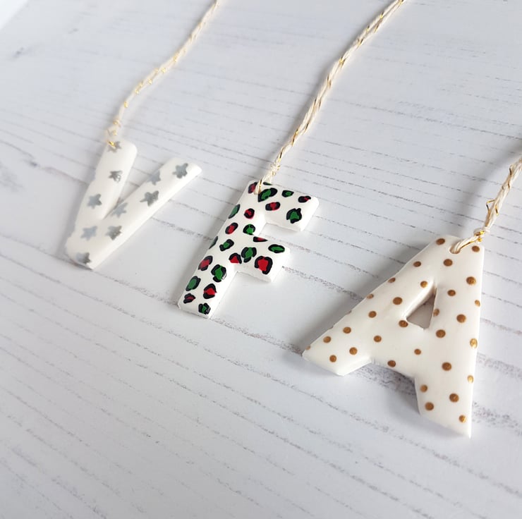 A letter of your choice, made from white polymer clay, with your choice of festive pattern hand painted to finish. Sealed to protect, and with twine added, perfect to hang in your home or on your tree!