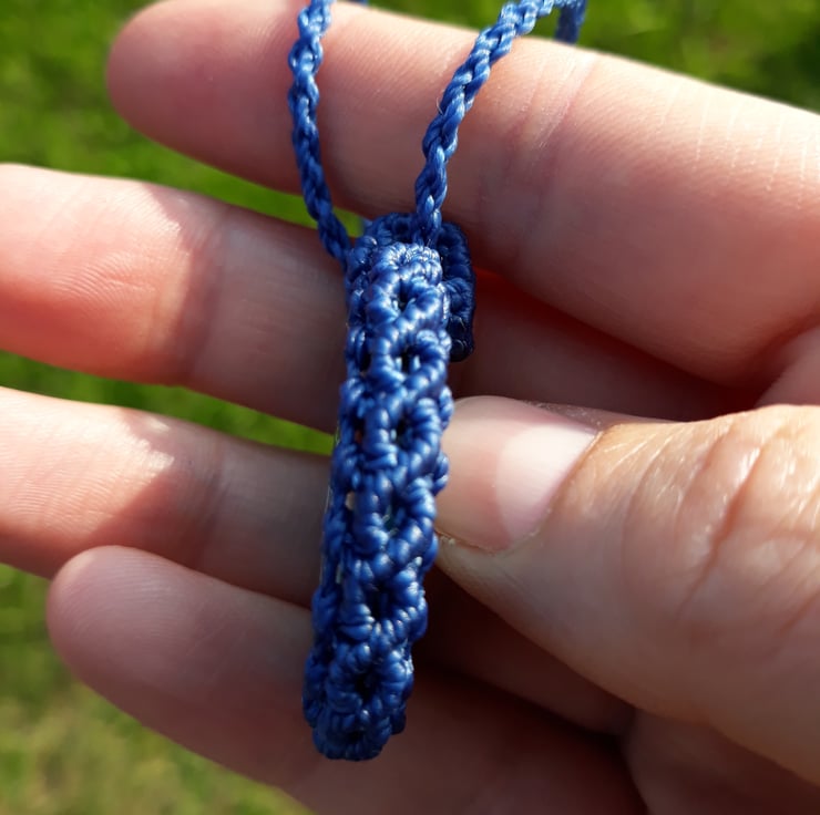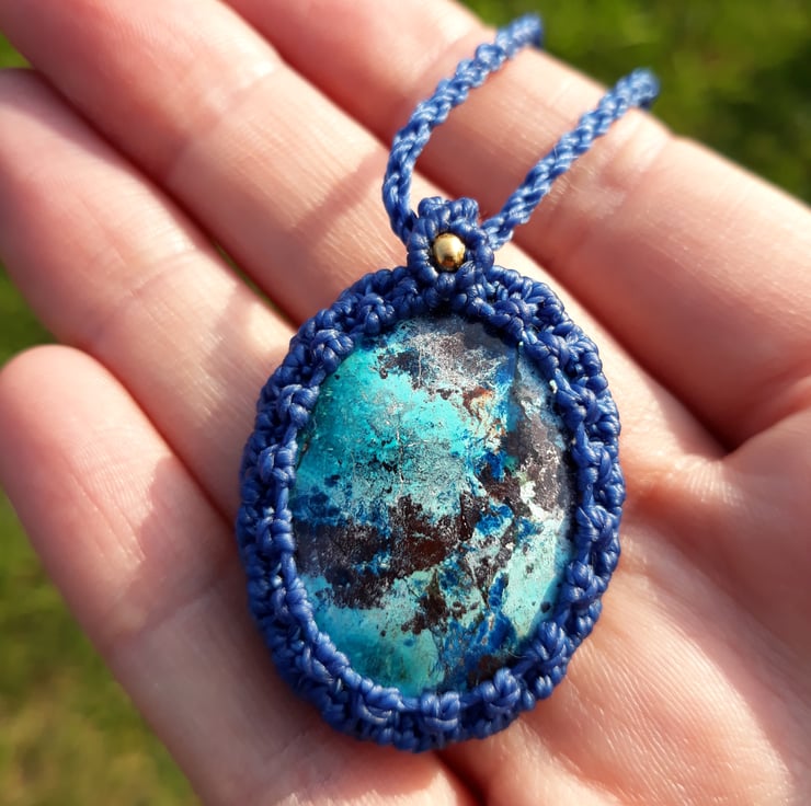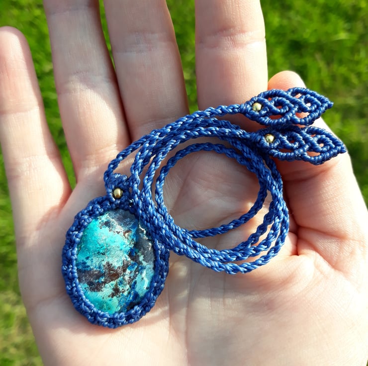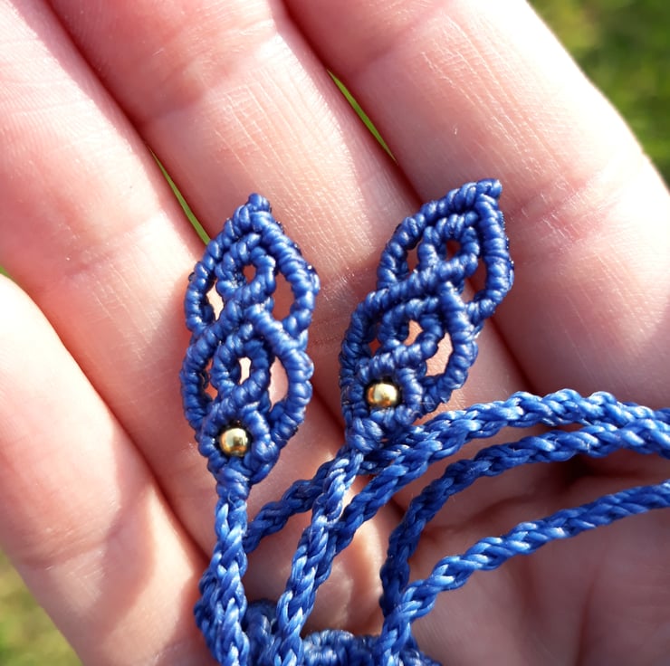 The pendant measures approx. 3.5cm in length and 3cm in width. It is made with a good quality cord. The beads are gold-plated. The cord is a handmade 4 braid with a 54cm drop finished with detailed cord ends.