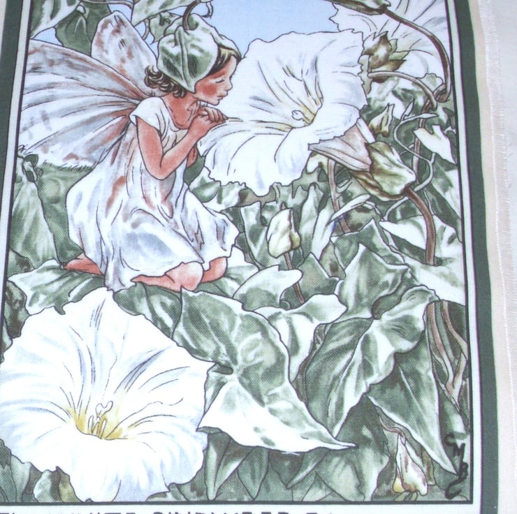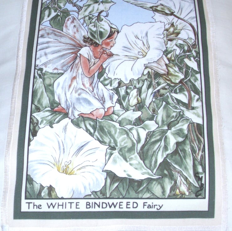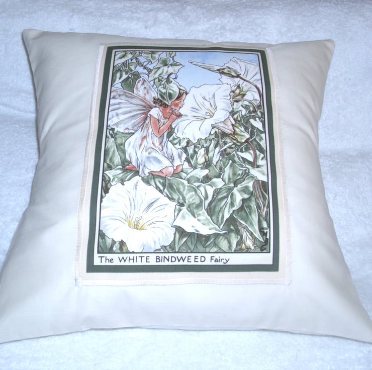 The White Bindweed fairy cushion with a little fairy in her white dress and flower cap sitting in among the big white bindweed flowers. appliqued onto a cream background