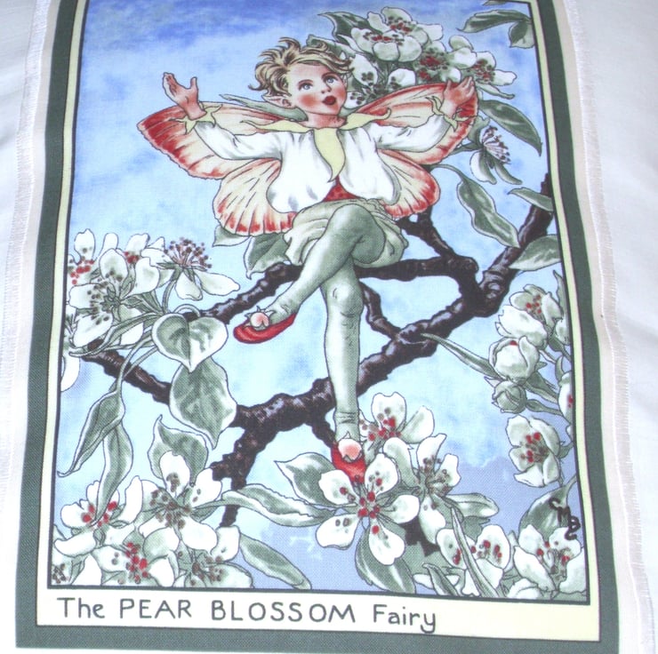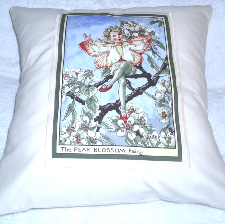 The Pear Blossom fairy cushion with a little fairy in their white shirt and green leggings and red shoes perched up in a pear tree among the Pear blossom. appliqued onto a cream background