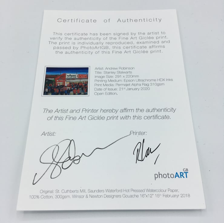 The framed print comes with a 'Certificate of Authenticity' which documents the details of the original painting and the art print. The Certificate of Authenticity is affirmed with a signature from both myself (the artist) and the printer.